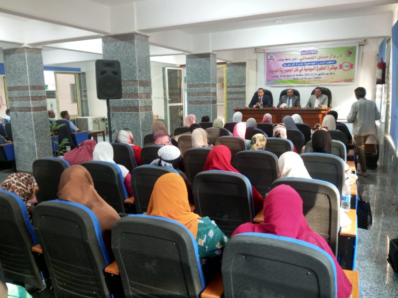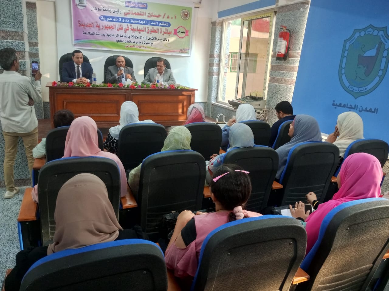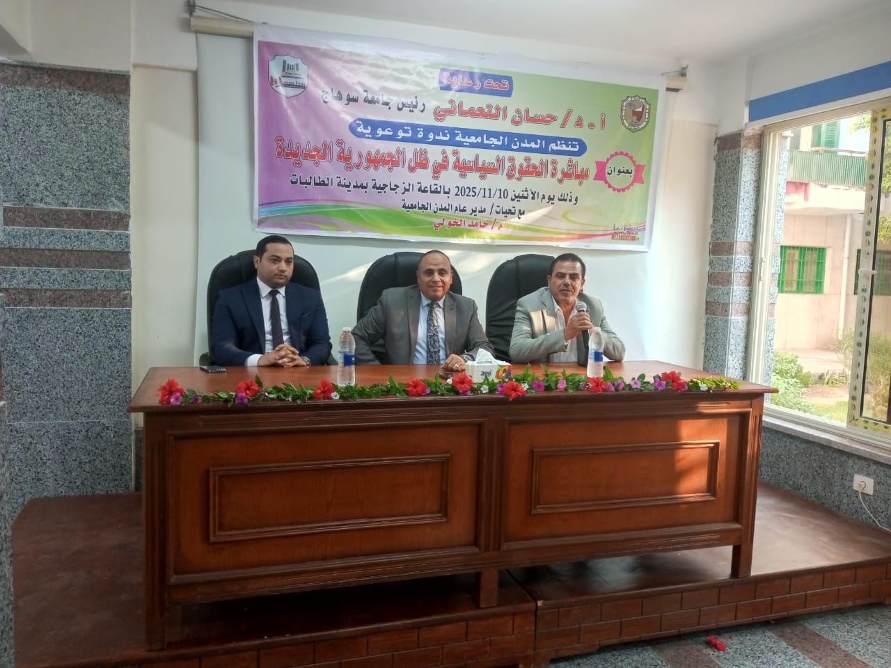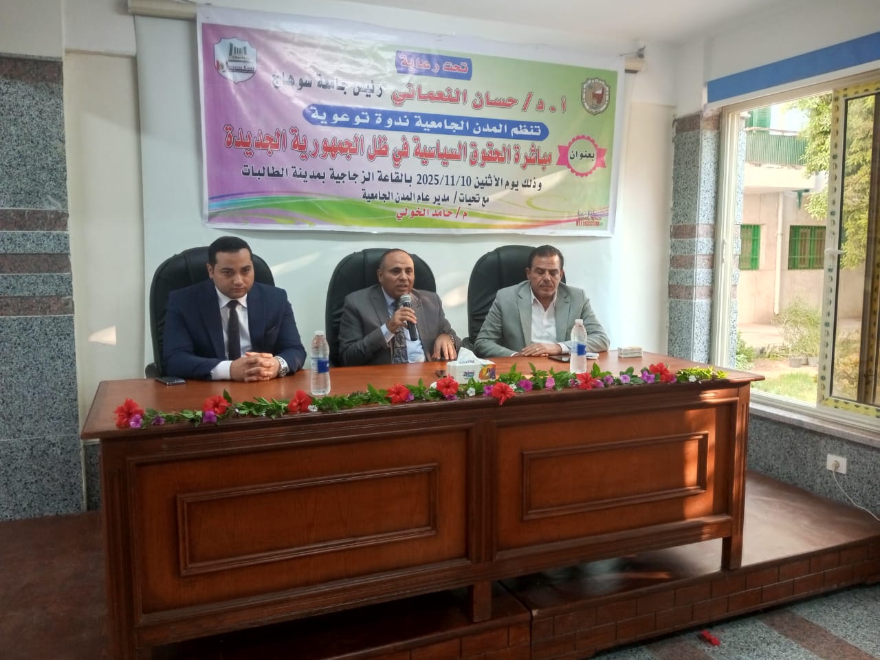 تحت رعاية الأستاذ الدكتور حسان النعماني رئيس الجامعة، وبحضور الأستاذ الدكتور خالد عبداللطيف نائب رئيس الجامعة لشئون خدمة المجتمع وتنمية البيئة، نظمت المدن الجامعية اليوم الإثنين الموافق 10 نوفمبر ندوة توعوية بعنوان “مباشرة الحقوق السياسية في ظل الجمهورية الجديدة”، وذلك بالقاعة الزجاجية بالمدينة الجامعية طالبات بمقر الجامعة القديم