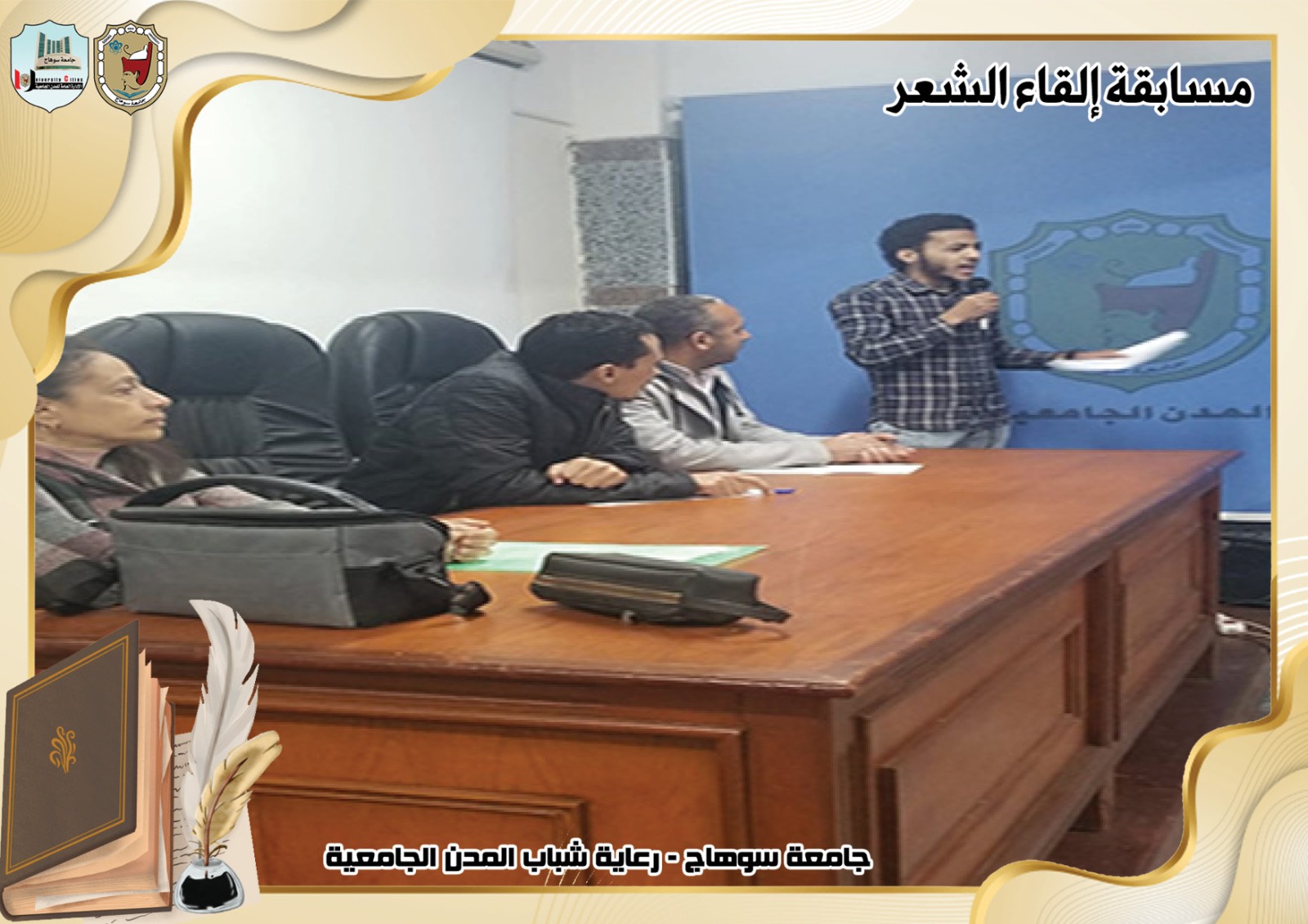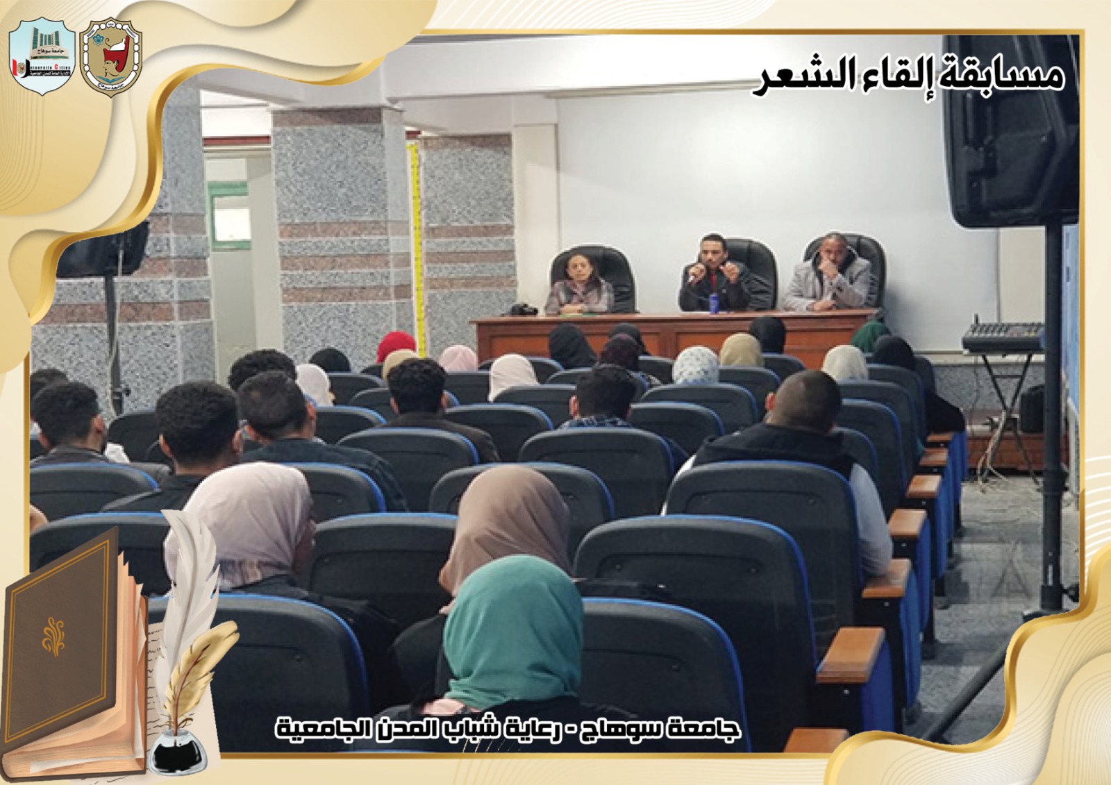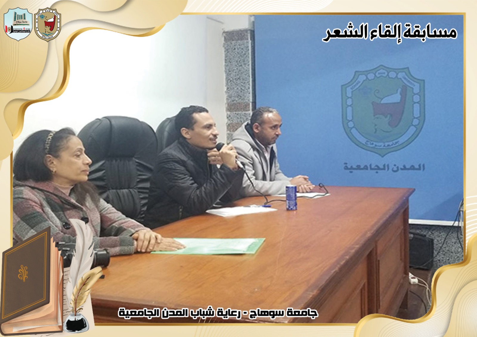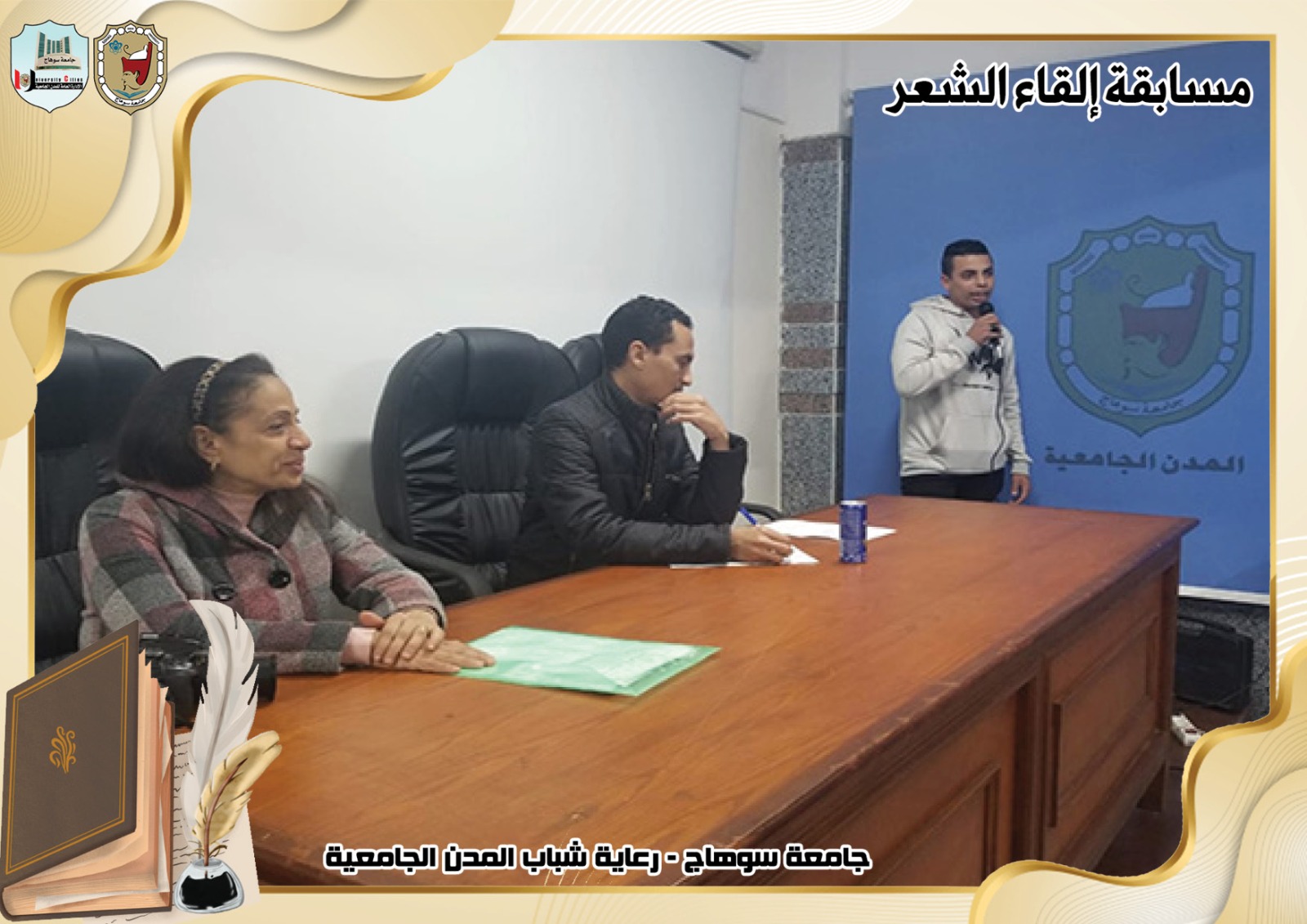 تحت رعاية السيد ا.د/حسان النعماني رئيس جامعة سوهاج ، وريادة السيد ا.د/عبدالناصر يس نائب رئيس الجامعة لشئون التعليم والطلاب ، وإشراف ا/حامد الخولى مدير عام المدن الجامعية ، وتحكيم ا.د/ الفاتح محمد الأستاذ بقسم اللغة العربية بكلية الآداب.