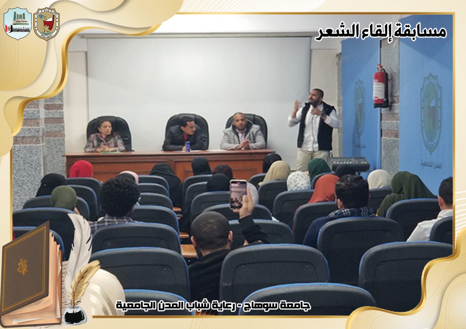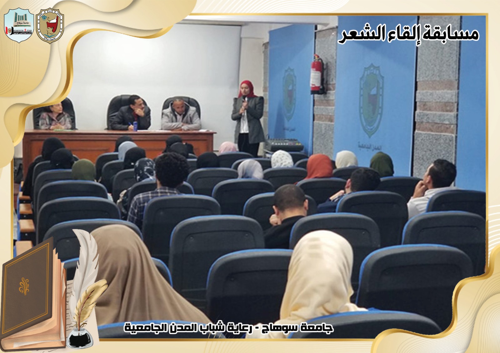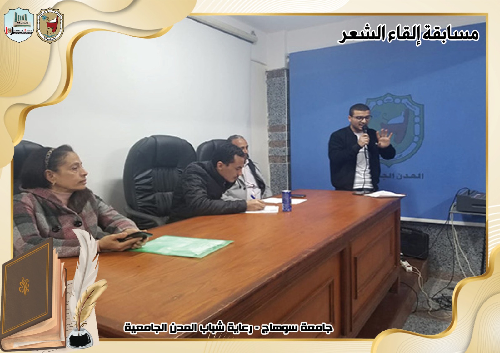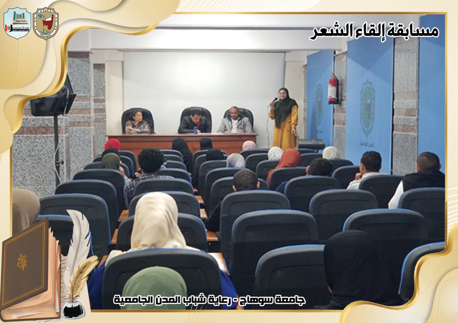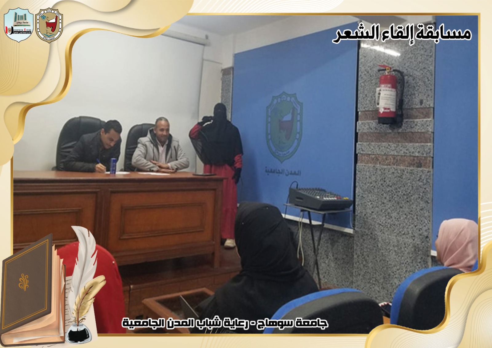 تحت رعاية السيد ا.د/حسان النعماني رئيس جامعة سوهاج ، وريادة السيد ا.د/عبدالناصر يس نائب رئيس الجامعة لشئون التعليم والطلاب ، وإشراف ا/حامد الخولى مدير عام المدن الجامعية ، وتحكيم ا.د/ الفاتح محمد الأستاذ بقسم اللغة العربية بكلية الآداب.